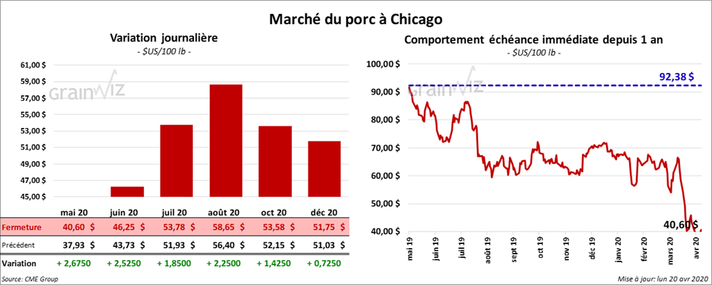 À la fermeture du marché, les contrats de porc US étaient en hausse de 2,02 $ à 2,82 $.