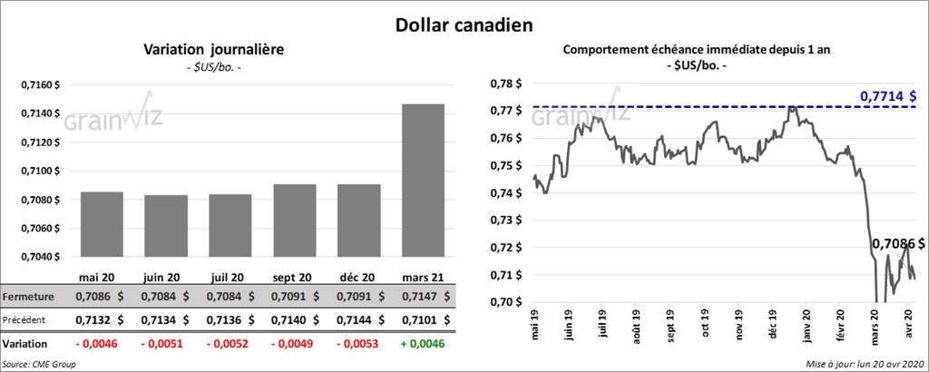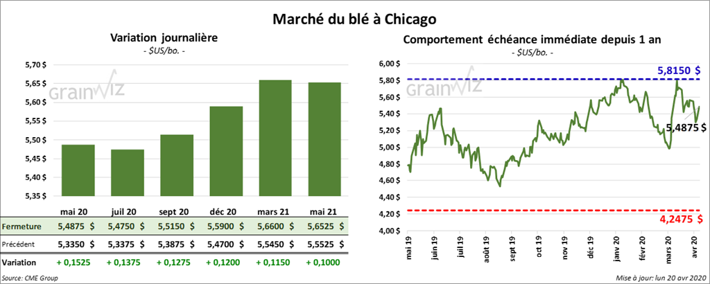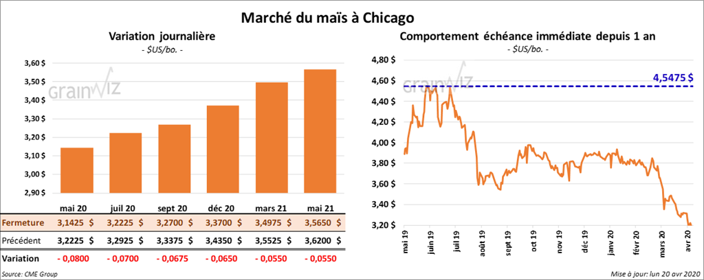 Les contrats de maïs US ont terminé la journée dans le rouge et le contrat mai 20 a été le plus faible. La chute du prix du pétrole US sous zéro a alimenté les liquidations. À la fermeture du marché, le contrat de maïs US mai 20 avait reculé de 8 ½ cents.