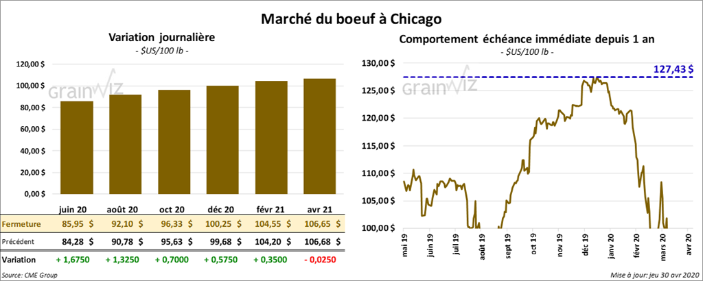 Le contrat de bœuf US avril 20 a expiré à 90 $. Les autres contrats de 2020 ont fini la session en hausse de 57 cents à 1,67 $. Toutefois, les contrats de veau US ont terminé en baisse de par trois chiffres. Celui août 20 a reculé le plus.