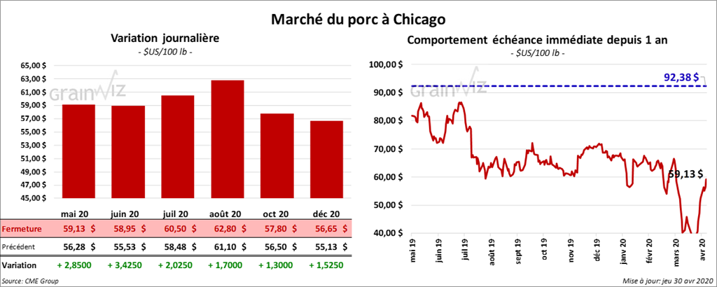 À la fermeture du marché, les contrats de porc US étaient dans le vert entre 1,30 $ et 3,42 $. Le contrat juin 20 a presque atteint sa limite à la hausse en terminant avec un gain de 3,42 $.