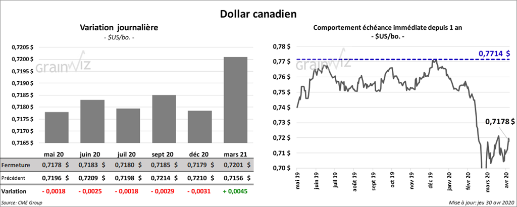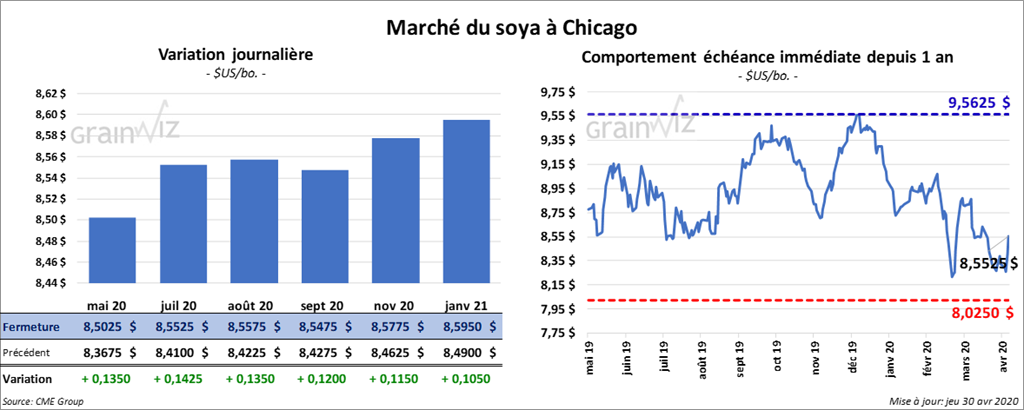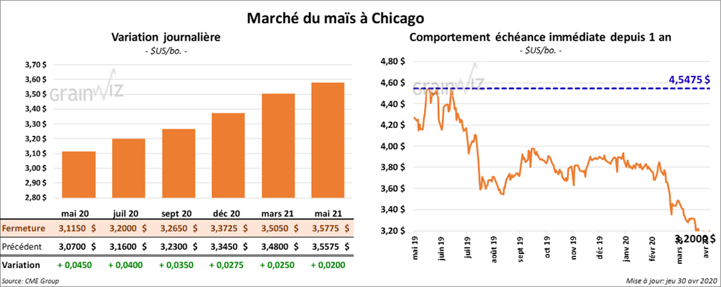 Les contrats de maïs US ont terminé la session en hausse. Cette dernière a été plus forte pour les contrats aux échéances les plus rapprochées. Ceux mai 20 et juillet 20 ont gagné plus de 5 cents. Par contre, les gains ont été limités à 2 ½ cents pour le contrat juillet 21.