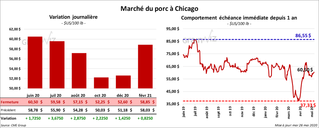 Les contrats de porc US ont fini la journée avec des gains de 1,42 $ à 3,65 $.