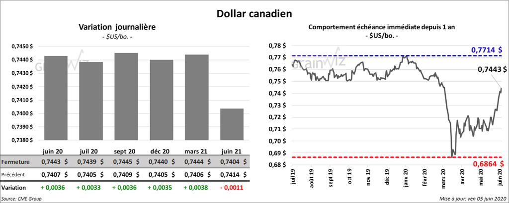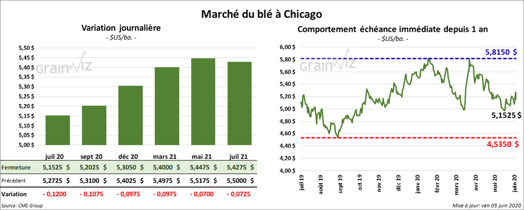 Les contrats de blé US ont terminé la session en baisse. À Kansas, le blé dur rouge d’hiver a reculé le plus avec des pertes de 9 à 11 cents. Ceux de blé tendre rouge d’hiver US ont clôturé dans le rouge de 5 ¾ à 8 ½. À la fermeture, le blé de printemps US avait reculé de 4 à 7 ½ cents. C’est celui juillet 20 qui a perdu le plus.