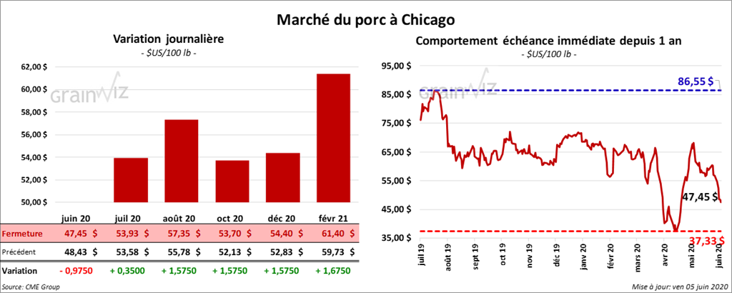 - Le 3 juin dernier, le CME Lean Hog Index était en baisse de 1,68 $ à 55,58 $.