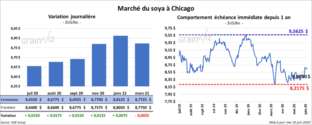 Les contrats de soya US juillet 20 jusqu’à novembre 20 ont clôturé avec des gains. Par contre, le contrat janvier 21 a terminé au neutre et celui mai 21 a terminé la journée en baisse de 2 cents.