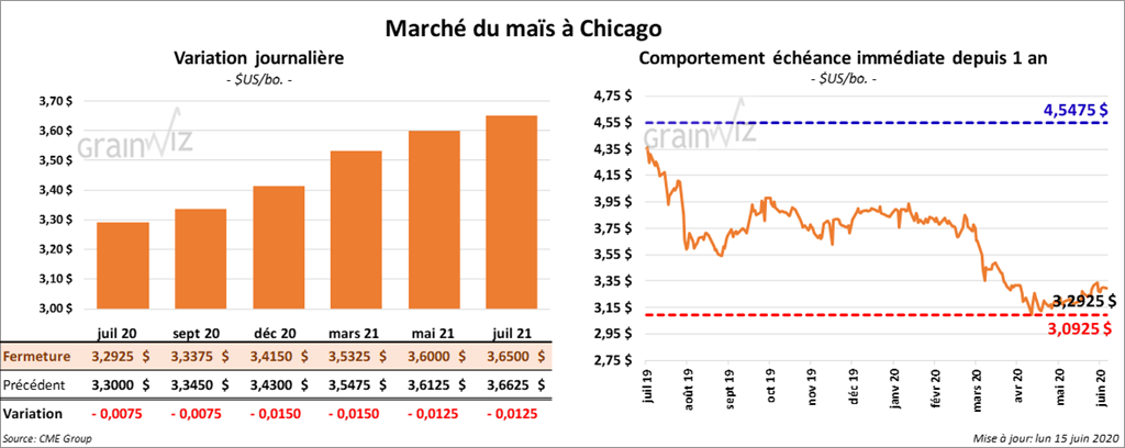 Les contrats de maïs aux échéances les plus rapprochées ont terminé la journée en baisse d’une fraction à 1 ¼ cent.