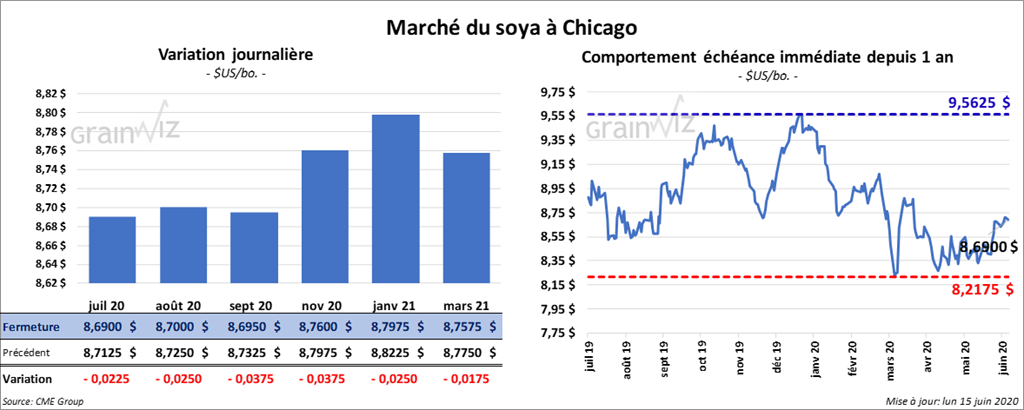 Les contrats de soya US aux échéances les plus rapprochées ont fini la journée dans le rouge de 1 ¼ à 3 ¼ cents. Ceux de tourteau de soya US ont également clôturé en baisse de 30 cents/tonne. Sous l’effet de la baisse des stocks (NOPA), l’huile de soya US a terminé la session en hausse de 27 points.