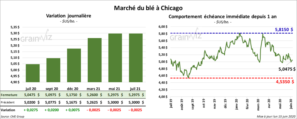 À la fermeture des marchés, la plupart des contrats de blé US étaient à un cent de leurs sommets. À Kansas, les contrats de blé dur rouge d’hiver à échéance 2020 ont clôturé avec des gains d’une fraction à 2 ¼ cents. Cependant, les contrats de blé tendre d’hiver US sont demeurés en territoire négatif, ou en baisse de 1 ½ à 2 ¼ cents. À Minneapolis, les contrats de blé dur rouge de printemps à échéance 2020 ont terminé en hausse de ¼ à 1 ¾ cent.