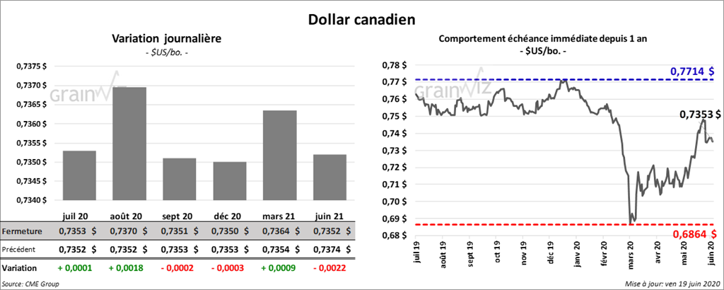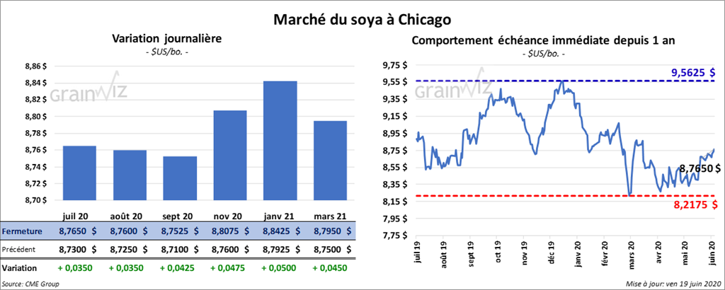 Les contrats de soya US ont terminé la session en hausse de 3 ½ à 5 cents. Le contrat janvier 21 a progressé le plus. Les contrats de tourteau de soya US ont fini la journée en baisse de 1,30 à 1,80 $/tonne. L’huile de soya US a clôturé avec des gains de 45 à 46 points.