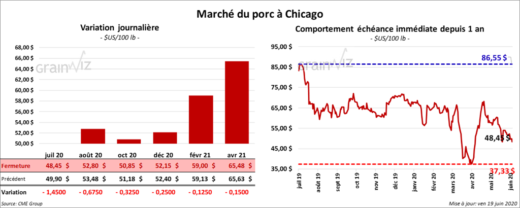 Les contrats de porc US ont terminé la journée en baisse par 3 chiffres. Celui juillet 20 a clôturé à 48,45 $, ce qui représente une baisse de 3,25 $ comparativement à vendredi la semaine passée.