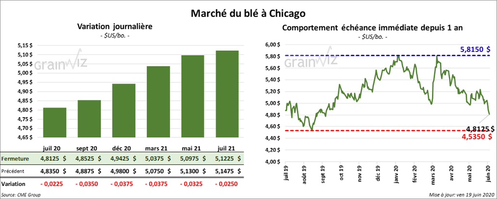 Les contrats de blé US ont terminé la session en baisse. Ceux de blé tendre rouge d’hiver ont reculé de 2 ¼ à 3 ¾ cents. Sur la semaine. Le contrat juillet 20 a perdu 20 ½ cents. Les contrats de blé dur rouge d’hiver ont fini en baisse d’une fraction à 1 ¼ cent. Ceux différés ont reculé le plus. À Minneapolis, les contrats de blé dur rouge de printemps ont baissé de ½ à ¾ cent. Par contre sur la semaine, le contrat juillet 20 a progressé de 13 ¾ cents.