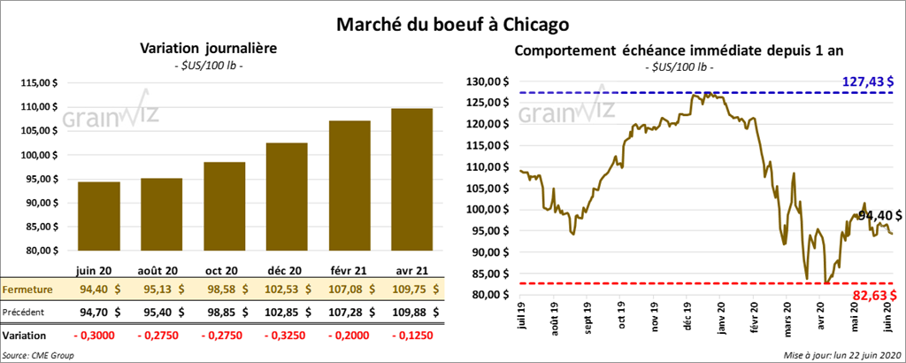 À la fermeture du marché, les contrats de bœuf US étaient en baisse de 20 à 32 cents. Ceux de veau US aux échéances les plus rapprochées ont également terminé la journée avec des pertes de 50 à 80 cents.