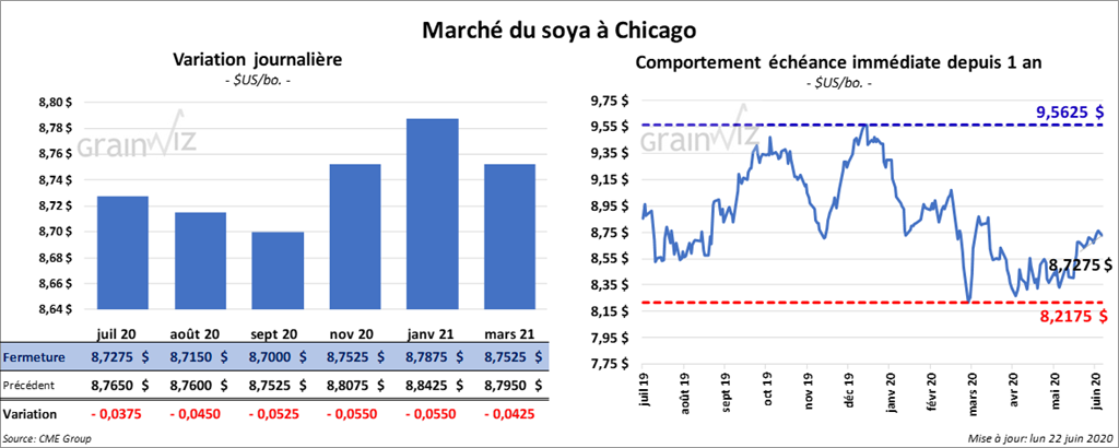 Les contrats de soya US ont fini la session avec des pertes limitées. Ceux juillet et mai 21 ont perdu une fraction de cent. Les autres contrats aux échéances les plus rapprochées ont terminé en recul de 1 à 1 ½ cent. Les contrats de tourteau de soya US ont fini en baisse de 50 cents/tonne. Ceux d’huile de soya US ont clôturé dans le rouge par 14 à 17 points.