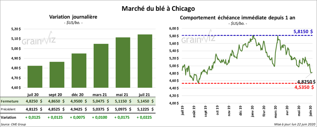 Les contrats de blé d’hiver US ont fini la journée avec des gains alors que ceux de blé de printemps US ont clôturé dans le rouge. À la fermeture des marchés, le blé tendre rouge d’hiver US avait progressé le plus en gagnant 3 à 4 ¼ cents. À Kansas, les contrats de blé ont terminé la session avec des gains de 2 ¾ à 3 ½ cents. À Minneapolis, les contrats de blé de printemps ont fini en baisse de plus de 1,2 %.