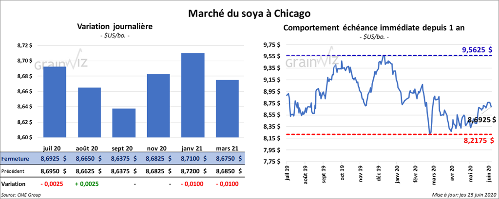 Les contrats de soya US ont terminé la session en baisse de 1 à 3 cents. Ceux de tourteau de soya US ont également fini en recul de 40 cents à 1,20 $/tonne. Les contrats d’huile de soya US ont fermé en baisse de 11 points.