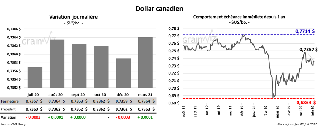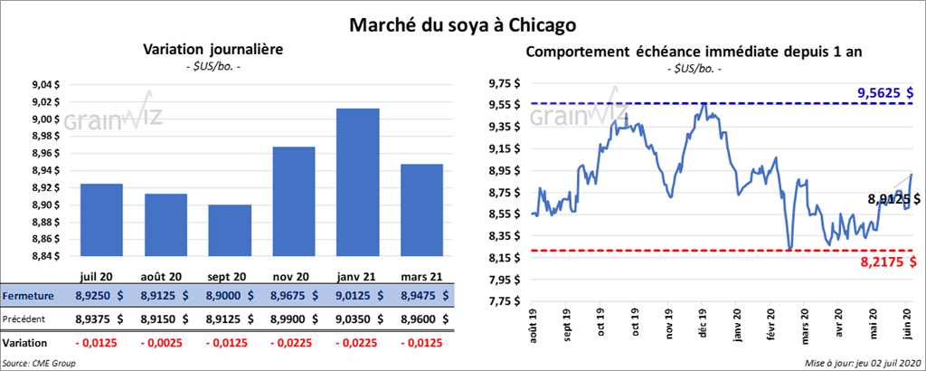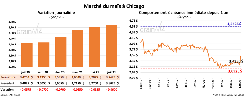 À la fermeture du marché, les contrats de maïs US étaient en baisse de 5 ¾ à 7 cents. Ceux septembre 20 et décembre 20 ont été les plus faibles.