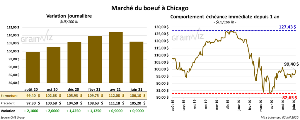 Les contrats de bœuf US ont clôturé avec des gains de 90 cents à 2,10 $. Sur la semaine, le contrat août 20 a progressé de 4,7 %. Les contrats de veau US aux échéances les plus rapprochées ont terminé dans le vert entre 1,55 $ à 1,82 $.
