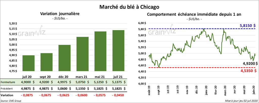 À Kansas, les contrats de blé dur rouge d’hiver ont fini la session en baisse de 7 ¾ à 8 ¾ cents, mais celui juillet 20 a terminé avec des pertes de 15 ¼ cents. Sur la semaine toutefois, il a progressé de 1,7 %. À Chicago, les contrats de blé tendre rouge d’hiver ont clôturé en baisse de 5 ¾ à 8 ¾ cents. Les contrats de blé de printemps US ont terminé en baisse de 6 ¼ à 11 ½ cents.