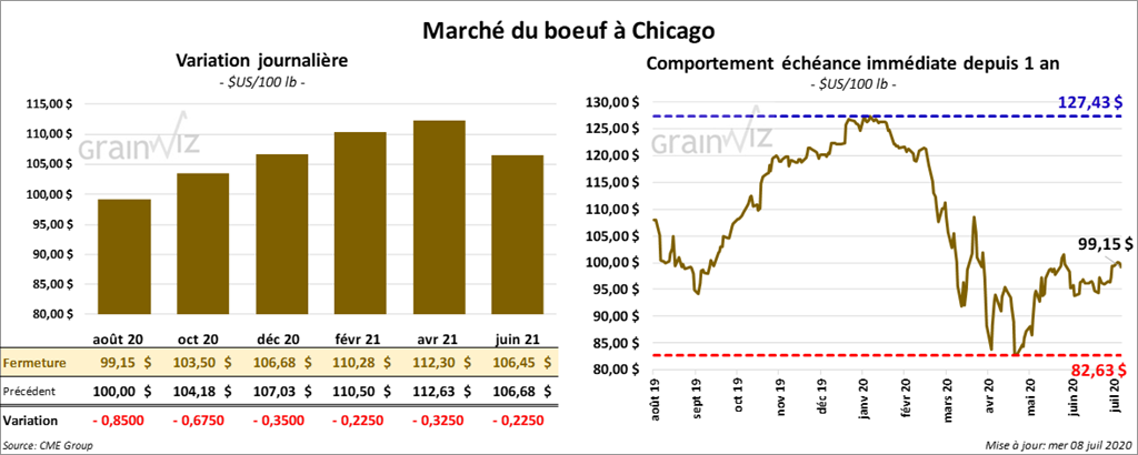 - Le 6 juillet dernier, le CME Feeder Cattle avait progressé de 10 cents à 130,13 $.