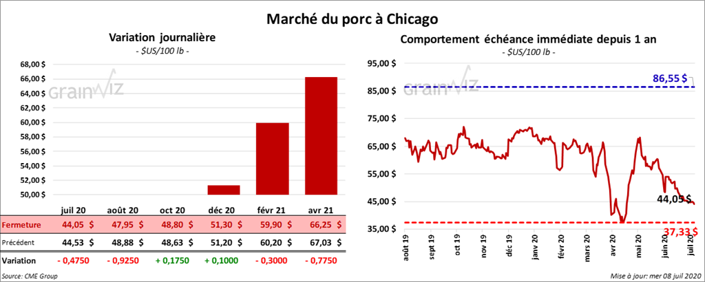 Les contrats de porc US octobre 20 et décembre 20 ont terminé la journée en baisse à respectivement 17 et 10 cents. Les autres contrats ont fini dans le rouge par plus de 92 cents.