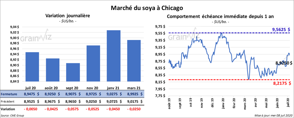 Les contrats de soya US ont fini la session en baisse de 1 à 5 ¾ cents. Ceux de tourteau de soya US ont également clôturé dans le rouge entre 1,50 et 1,70 $/tonne. Les contrats d’huile de soya US ont terminé la journée en recul de 30 à 33 points.