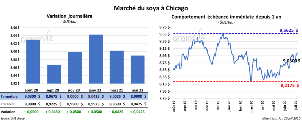 Les contrats de soya US ont fini la session avec des gains de 4 ¼ à 5 cents. Ceux de tourteau de soya US ont également terminé la séance en hausse de 2,10 $ à 2,60 $. Par contre, les contrats d’huile de soya sont demeurés au neutre.
