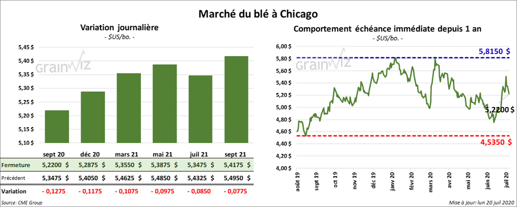 Les contrats de blé US ont clôturé en baisse. Ceux de blé d’hiver US ont reculé le plus avec des pertes de 2 chiffres. À Chicago, les contrats blé tendre rouge d’hiver aux échéances les plus rapprochées ont fini en recul de 8 ½ à 12 ¾ cents. Les contrats de blé dur rouge d’hiver ont quant à eux terminé la journée avec des pertes de plus de 13 ¾ cents. À Minneapolis, les contrats de blé dur rouge de printemps ont clôturé en baisse de 5 à 6 ¼ cents.