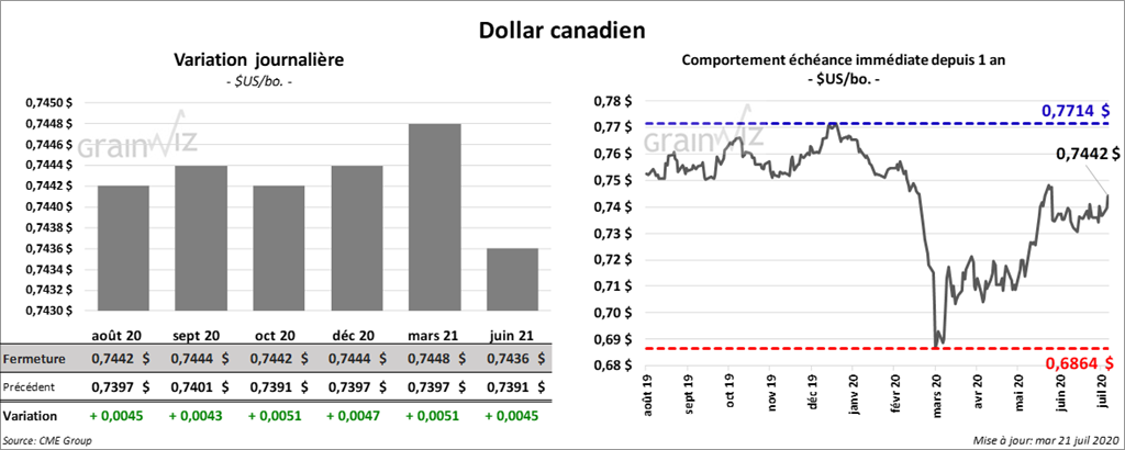 - Agriculture et Agroalimentaire Canada a abaissé sa projection de la production de blé canadien 2020/2021 de 300,000 tonnes à 33,6 millions de tonnes. Le rendement a été estimé à 3,39 tonnes/hectare sur une superficie de 9,899 millions d’hectares. L’USDA voit plutôt la production canadienne de blé à 34 millions de tonnes avec un rendement de 3,47 tonnes/ hectare sur une superficie de 9,8 millions d’hectares.