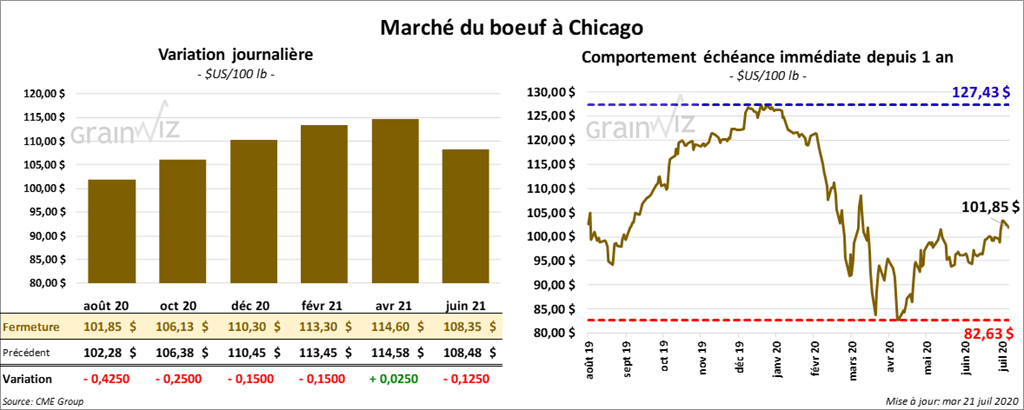 Les contrats de bœuf US aux échéances les plus rapprochées ont terminé la journée en baisse de 15 à 42 cents. Toutefois, celui avril 21 a clôturé en hausse de 2 cents. Les contrats de veau US ont clôturé sur une note partagée. Ceux août 20 et septembre 20 ont fini en baisse alors que ceux octobre 20 et novembre 20 ont terminé la séance en hausse.