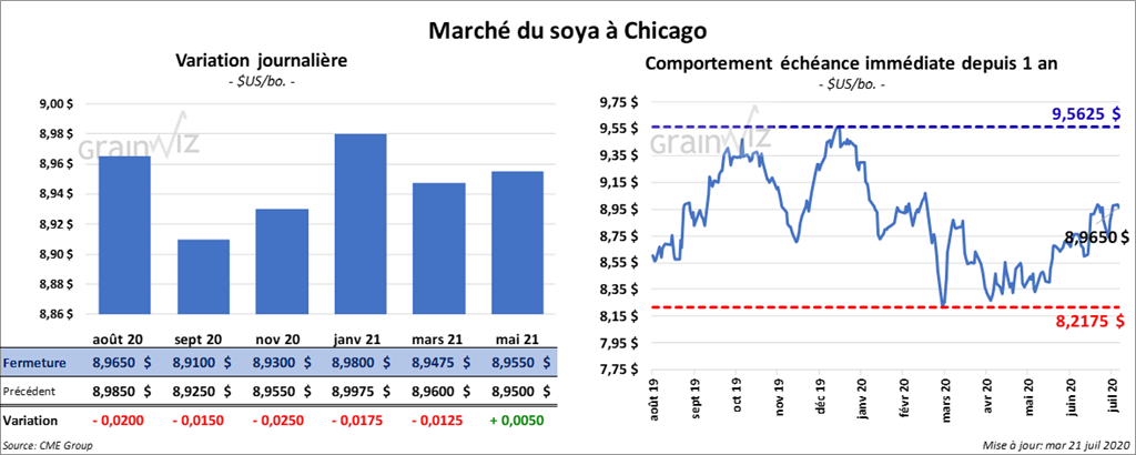 Les contrats de soya US ont fini la session en baisse de 6 ¼ à 7 cents. Ceux différés ont également clôturé dans le rouge par 2 à 3 ½ cents. Les contrats de tourteau de soya US ont terminé la journée en baisse de 3 $/tonne. Par contre, ceux d’huile de soya US ont fait l’inverse en finissant la session en hausse de 13 à 14 points.