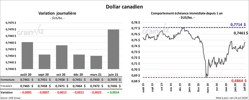 Les contrats de soya US ont fini la journée en baisse. Ceux différés étaient en recul d’une fraction de cent. Le contrat août 20 a perdu 1 ½ cent. Les contrats de tourteau de soya US ont terminé la session en hausse de 40 cents/tonne. Ceux d’huile de soya ont clôturé sur une note partagée.