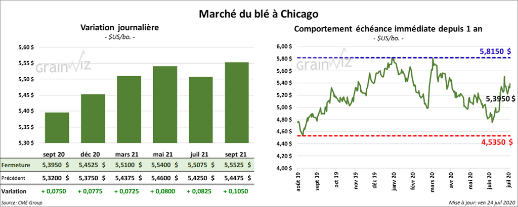 À Chicago, les contrats de blé ont terminé la journée dans le vert. Ceux de septembre 20 ont progressé de 0,89 % sur la semaine. À Kansas, les contrats de blé ont fini en hausse de 8 à 8 ¼ cents. Ceux de blé dur rouge de printemps US ont terminé la session avec des gains entre 3 ¾ à 5 ¼ cents.