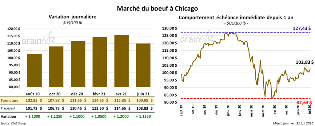 Les contrats de bœuf US ont terminé la session avec des gains. Celui août 20 a gagné 1,10 $, ce qui a poussé le gain de la semaine à 1,50 $. Sur la semaine, le contrat de veau US août 20 a progressé de 2,62 $ alors que les contrats aux échéances les plus rapprochées ont gagné entre 1,65 $ et 2,25 $.