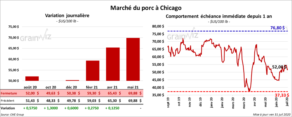 Les contrats de porc US aux échéances les plus rapprochées ont fini la journée en hausse de 12 cents à 1,30 $. Pour le contrat août 20, le gain de 57 cents réalisé aujourd’hui a permis de limiter la perte hebdomadaire à 2,00 $. Il va expirer dans 2 semaines, le 14 août pour être plus précis.