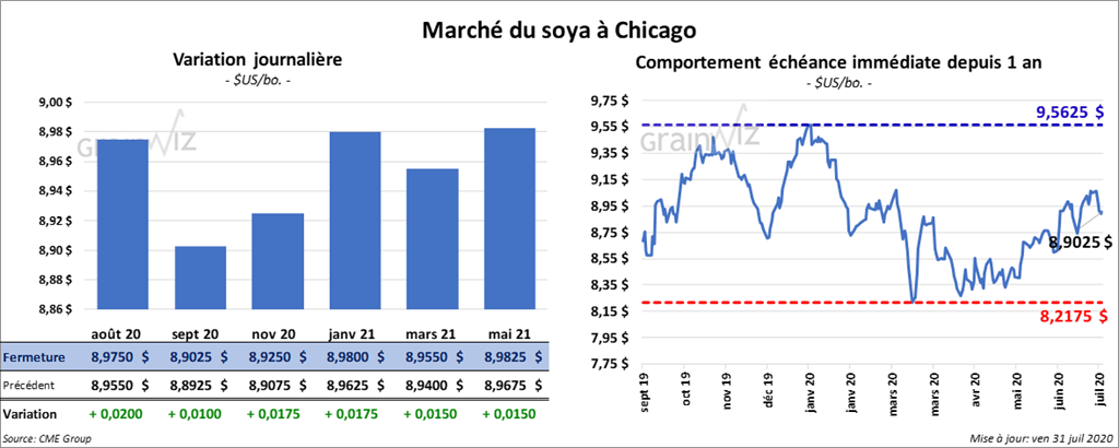 Les contrats de soya US aux échéances les plus rapprochées ont terminé la session avec des gains allant de 3 ½ à 5 ¾ cents. Le contrat de tourteau de soya US août 20 a fini la journée en baisse de 50 cents/tonne. Les contrats d’huile de soya US ont clôturé en hausse de 53 points.