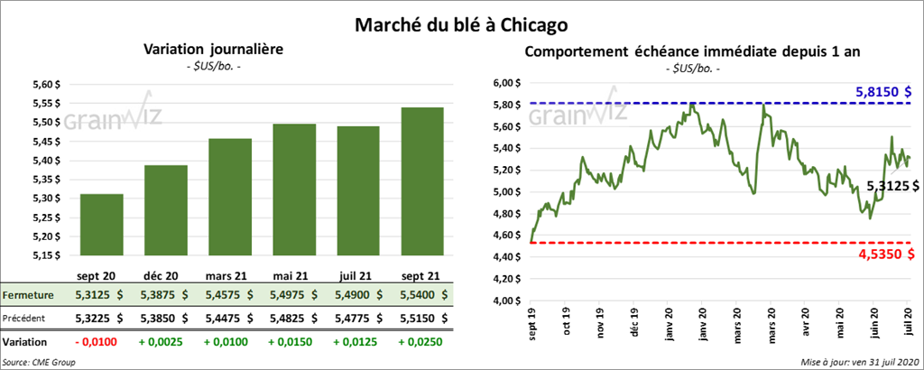 Les contrats de blé US ont terminé la journée avec des gains. À Chicago, les contrats de blé tendre rouge d’hiver US aux échéances les plus rapprochées ont fini dans le vert entre 1 ¾ à 4 cents. Le contrat septembre 20 a eu des pertes hebdomadaires de seulement 8 cents. À la fermeture du marché à Kansas, les contrats de blé étaient en hausse de 2 ½ à 3 ½ cents. Sur la semaine, le contrat de blé dur rouge d’hiver US septembre 20 a perdu 1,56 %. À Minneapolis, les contrats de blé dur rouge de printemps ont clôturé dans le vert par plus de 1 ½ cents.