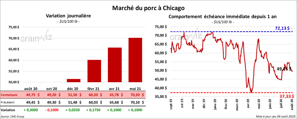 Les contrats de porc US ont fini la séance en hausse de 2 à 30 cents. Par contre, celui octobre 20 a clôturé en baisse de 10 cents et celui août 20 a gagné 52 cents.