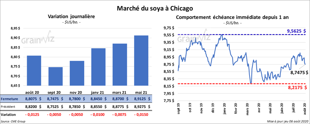 Les contrats de soya US ont terminé la journée dans le rouge par ¼ et 1 ½ cents. Ceux août 20 et septembre 20 ont encaissé les plus fortes pertes. Les contrats de tourteau de soya US aux échéances les plus rapprochées ont fini la séance en baisse de 1,50 $ à 1,60 $/tonne. Le contrat d’huile de soya US août 20 a clôturé dans le rouge, mais ceux septembre 20 et octobre 20 ont terminé en hausse.