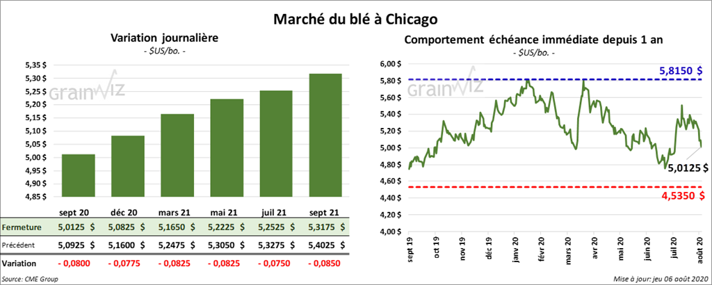 Les contrats de blé US ont terminé la session avec des pertes. Les contrats de blé tendre rouge d’hiver US ont fini en recul de 8 ½ à 9 ¾ cents. À Kansas, à la fermeture, les contrats de blé dur rouge d’hiver avaient perdu entre 8 et 9 ¼ cents. À Minneapolis, les contrats de blé ont fini la journée en baisse de 4 à 5 ½ cents.