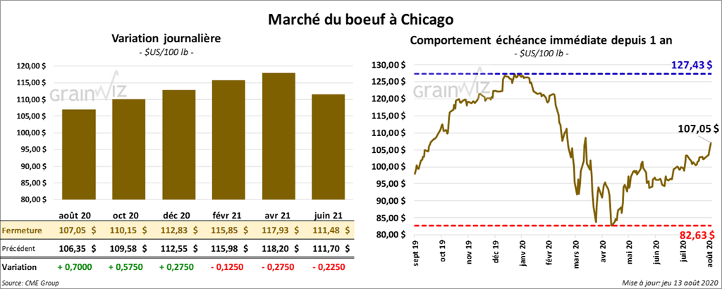 - Le 11 août dernier, le CME Feeder Cattle Index était en hausse de 20 cents à 142,62 $.