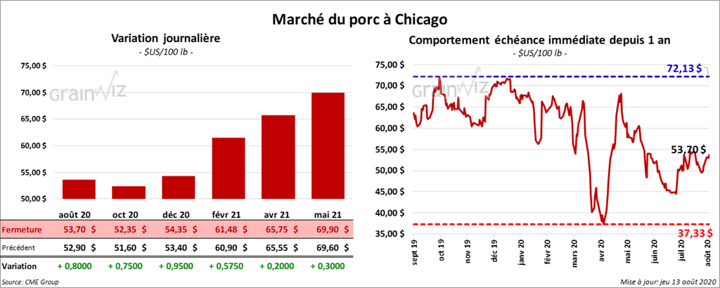 - Le 11 août dernier, le CME Lean Hog Index était en hausse de 3 cents à 53,82 $.