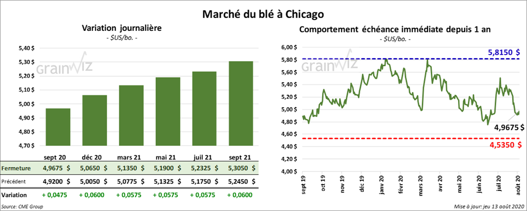 À la fermeture des marchés, les contrats de blé US étaient dans le vert. À Chicago, ils ont terminé en hausse de 5 ½ à 6 ½ cents. À Kansas, les contrats de blé dur rouge d’hiver ont fini avec des gains de 6 à 7 ¼ cents. Ceux de blé de printemps US ont clôturé en progression de 2 à 4 ¾ cents.
