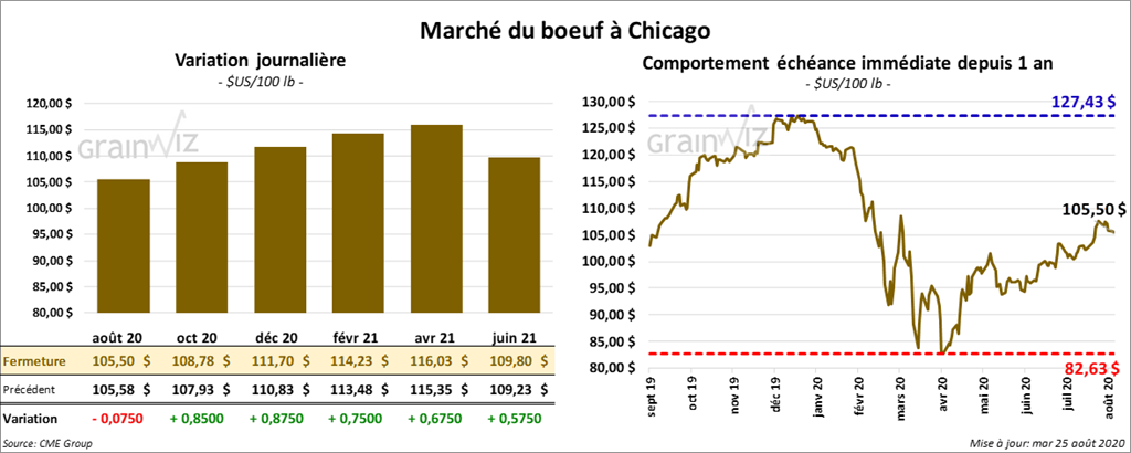 Le contrat de bœuf US août 20, qui devrait expirer dans une semaine, a terminé la journée en baisse. Les autres contrats aux échéances les plus rapprochées ont fini en hausse entre 67 et 87 cents. Les contrats de veau US ont clôturé avec des gains limités à 25 cents.