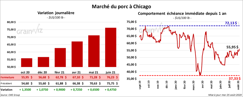 Les contrats de porc US octobre 20 et décembre 20 ont fini la journée en hausse par 3 chiffres. Les autres contrats aux échéances les plus rapprochées ont également clôturé avec des gains entre 47 et 90 cents.