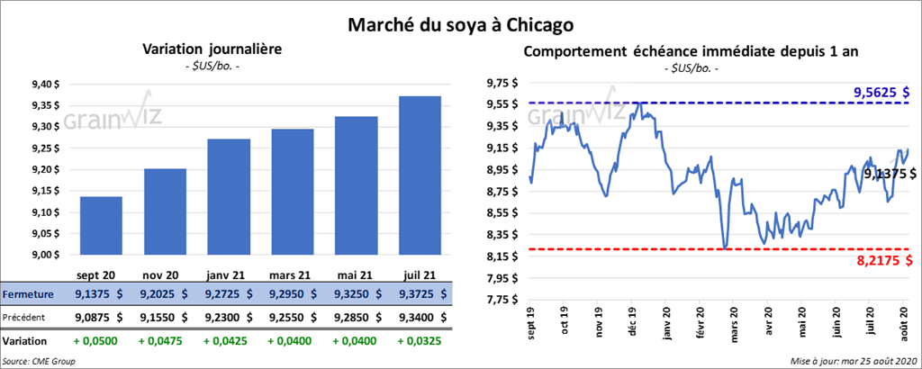 Les contrats de soya US ont terminé la journée presque à leurs sommets avec des gains entre 11 ¼ et 14 ½ cents. Ceux de tourteau de soya US ont également clôturé dans le vert entre 2,50 $ et 3,00 $/tonne. Les contrats d’huile de soya US ont fini en hausse de 32 à 33 points.