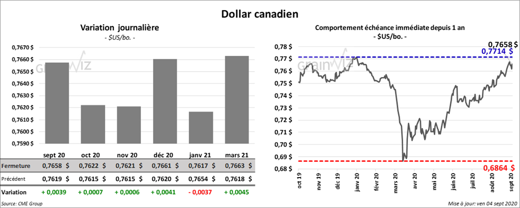 - Pour le 31 juillet dernier, Statistique Canada estime que les inventaires de blé canadien étaient de 5,03 millions de tonnes. Les analystes s’attendaient à 5,7 millions de tonnes. Il s’agit en fait d’une baisse de 14,65 % par rapport à la même période l’an passé. Cette réduction est principalement due à la baisse des stocks de blé durum.