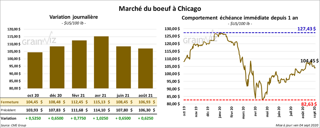 - Le 3 septembre dernier, le CME Feeder Cattle Index était en hausse de 52 cents à 140,20 $.