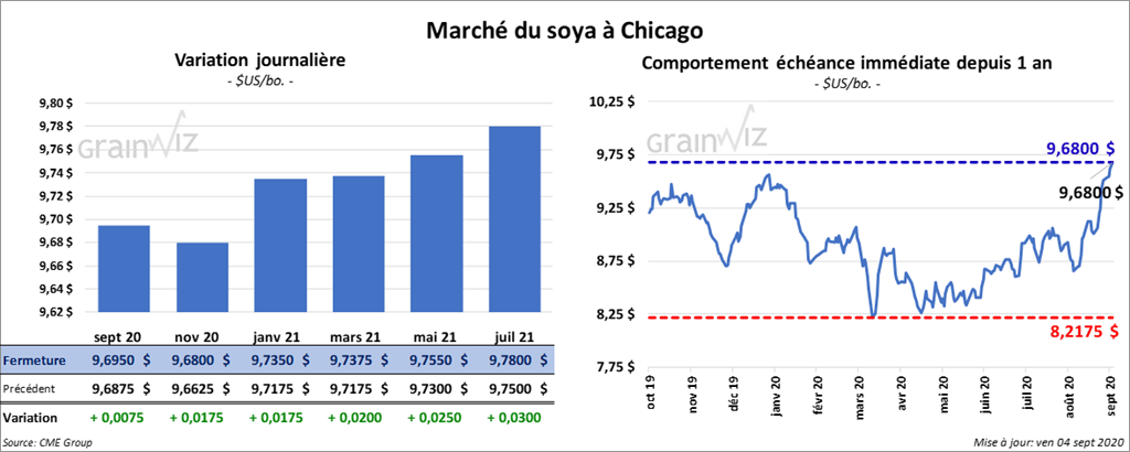 Les contrats de soya US ont fini la journée avec des gains d’une fraction à 3 cents. Ceux de tourteau de soya US ont également clôturé dans le vert par 5,40 $/tonne. Les contrats d’huile de soya US ont terminé la séance en baisse de 32 points.