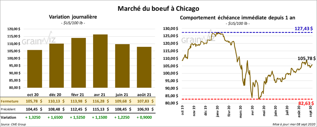 Les contrats de bœuf US ont fini la journée en hausse par 3 chiffres. Ceux décembre 20 ont été les plus fermes en clôturant en progression de 1,52 %. Les contrats de veau US ont aussi terminé en hausse par 3 chiffres ou à plus que 95 cents.