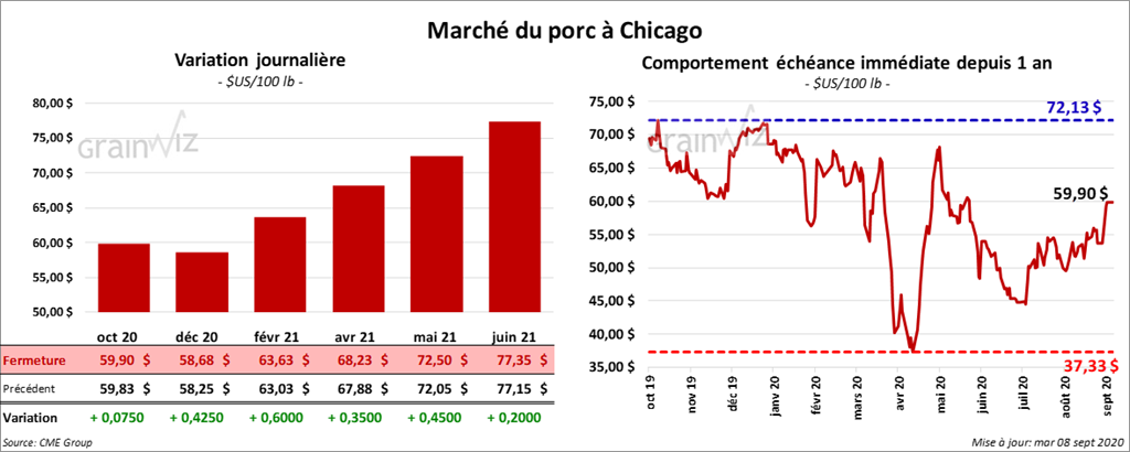 - Le 3 septembre dernier, le CME Lean Hog Index était en hausse de 51 cents à 58,64 $.